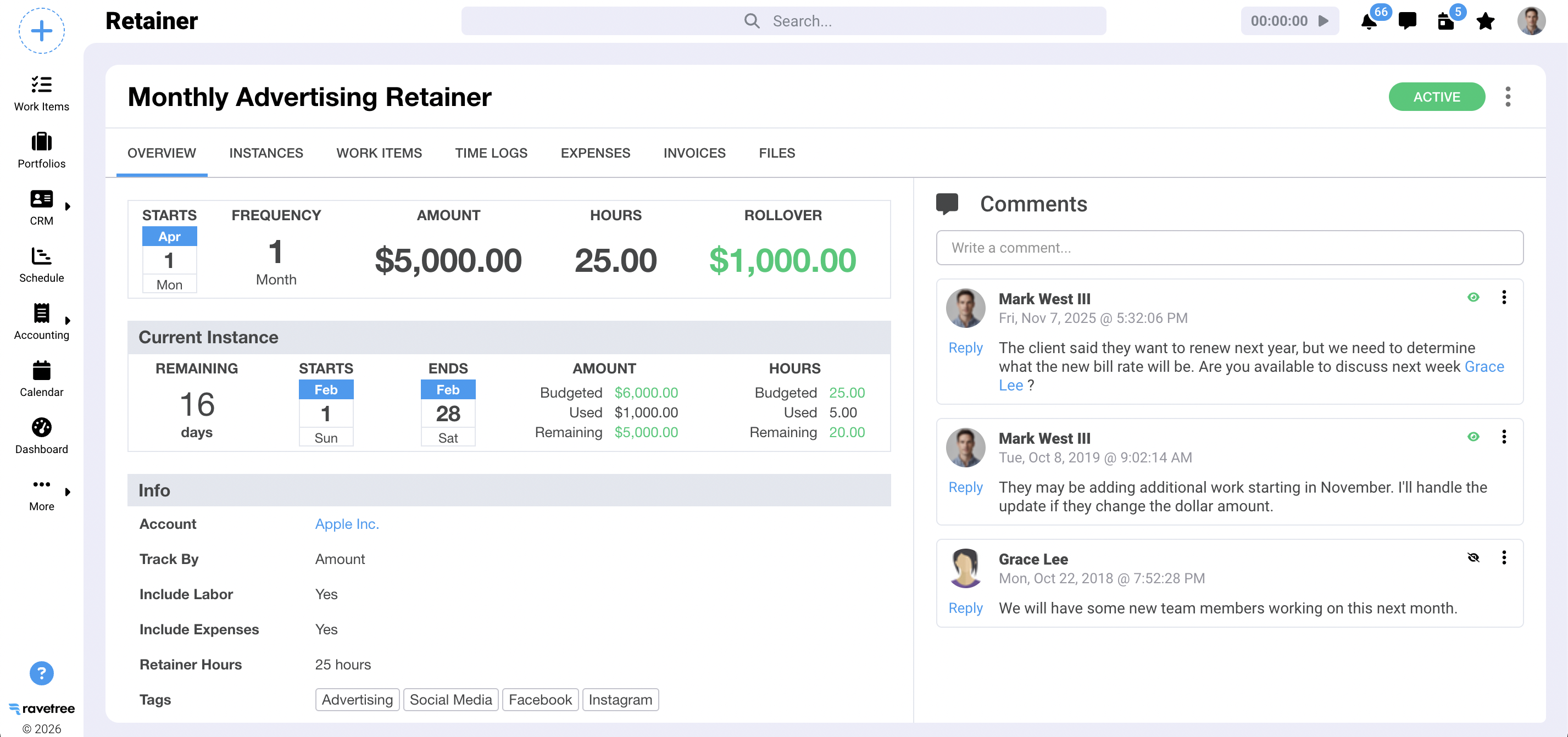 Ravetree addresses these challenges through purpose-built retainer management functionality that unifies time tracking, project management, billing, and client communication in a single platform designed specifically for professional services firms.