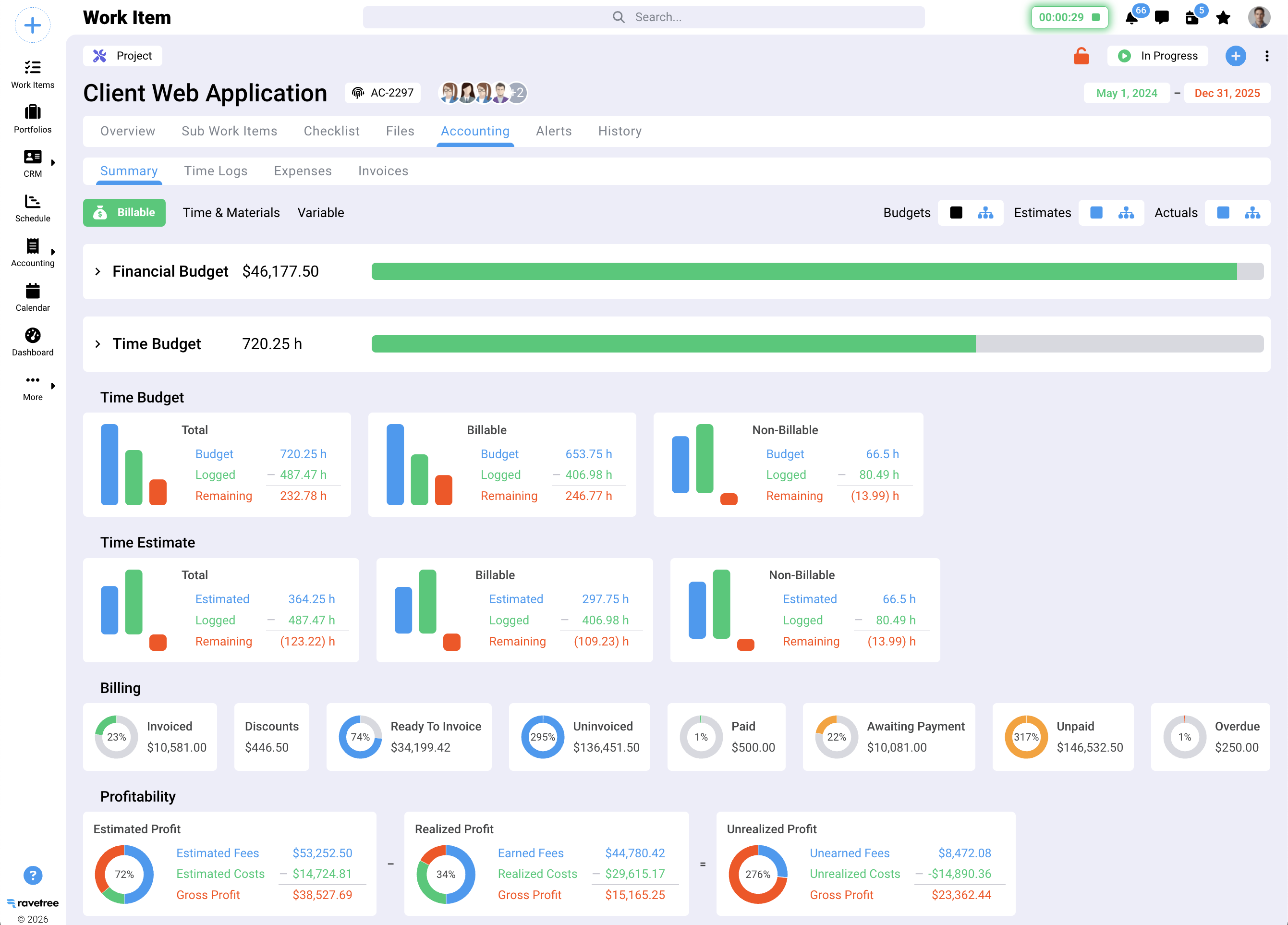 Financial management capabilities extend beyond basic invoicing. Ravetree handles complex billing scenarios including retainers, milestone billing, time-and-materials, and fixed-fee arrangements. Retainer management capabilities streamline recurring revenue tracking, ensuring agencies never miss billable hours on monthly retainer clients—a critical advantage for agencies building predictable revenue streams.